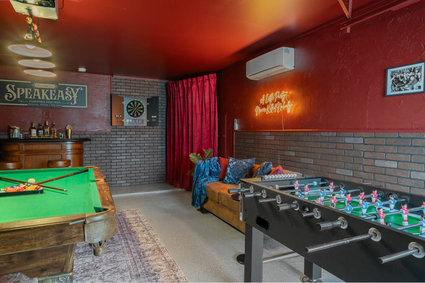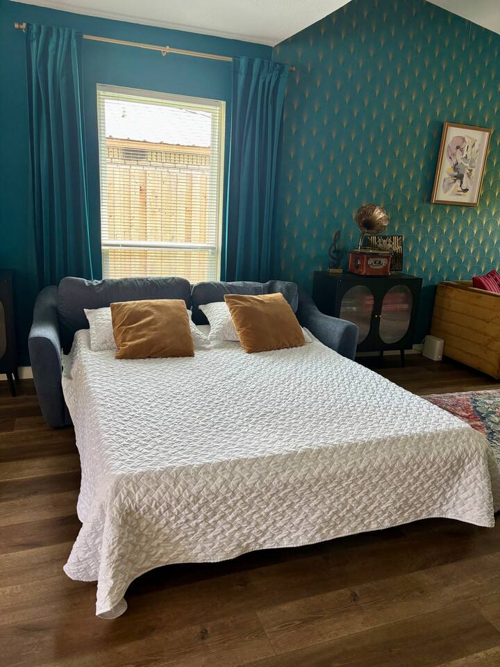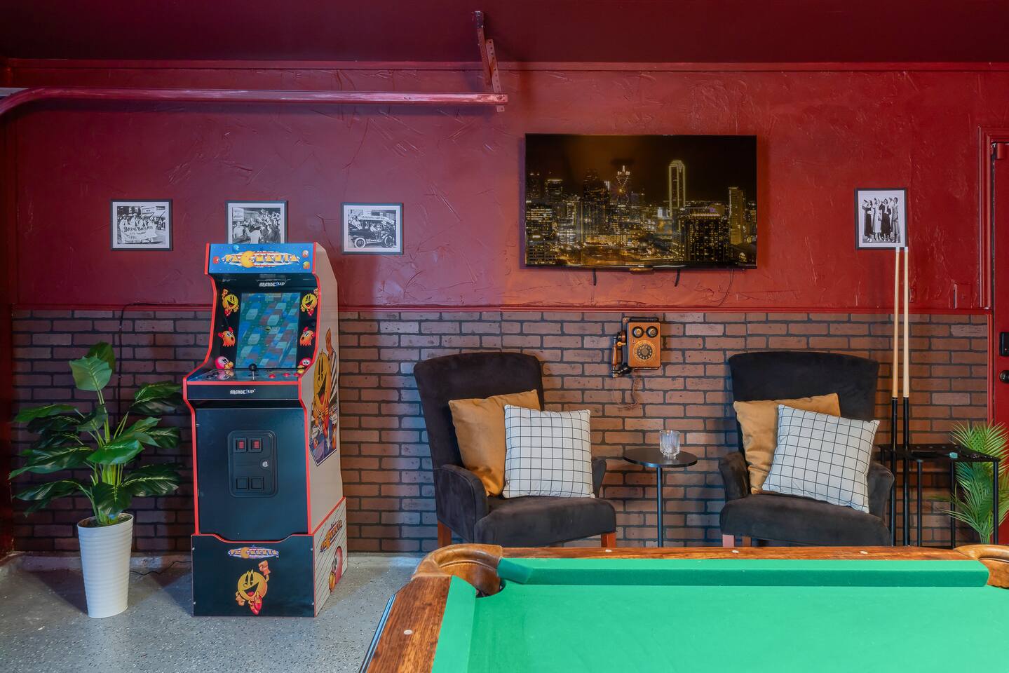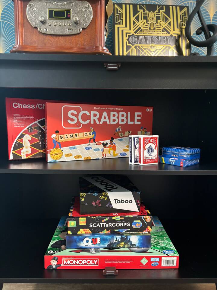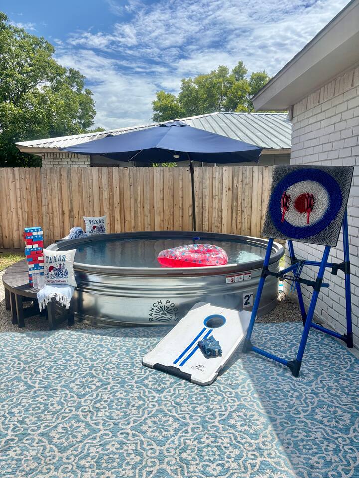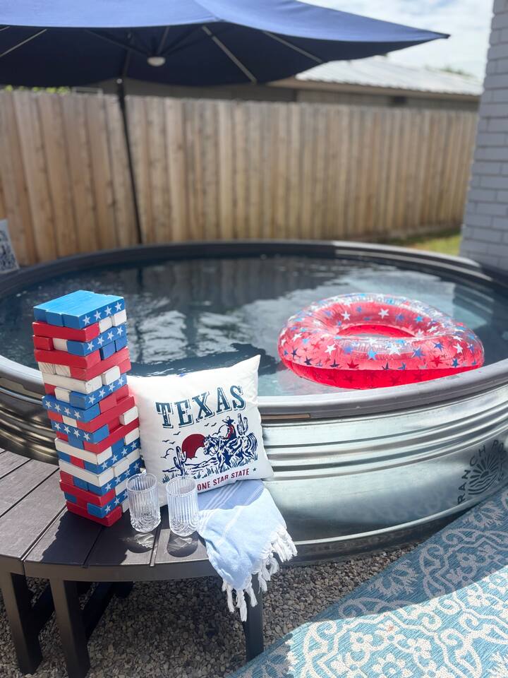 Gatsby Getaway ~ This unique place has a style all its own with a modern art deco 1920's Gatsby theme and hidden speakeasy with a bar, pool table, foosball table, dart board, vintage arcade game, board games, bag toss and axe throwing. Stock Tank Pool ~ Kick back and soak up the good life! Our stock tank pool is HEATED, 2ft deep, chlorinated and open all year round. Use it to cool down in the Texas sun as a pool or turn up the heat in the winter and use it as a hot tub (no jets). Neighborhood~ Our charming neighborhood is currently going through a transformation. It is one of the original neighborhoods in this lake community that is rapidly growing as our city grows. The street is quiet, and the neighbors are friendly. Enjoy the private driveway parking located in the back entrance of our property through its alley entrance. Home~ Our recently updated home is completely stocked with everything you need for your large group. Each room includes a TV, Fan, hangers, black-out curtains, luggage rack, and a light up mirror vanity to get ready with or it can serve as a workspace. Our kitchen comes completely equipped with everything for a family large group to cook with. ***Please keep in mind the attached bathroom is connected to the larger, double-bed room, not the primary with the king bed. *** 4th bedroom is the living room area with a sleeper sofa. Entertainment~ We believe that entertainment is essential, which is why each room comes equipped with a Smart TV, allowing you to watch your favorite shows and movies on streaming services. We do not currently have cable tv, but we also provide a plethora of boardgames, outdoor games, are our speakeasy room includes a vintage Pac-Man arcade game, pool table, foosball table and dart board. We also have a record player that doubles as a Bluetooth speaker and radio. HOUSE RULES: *No large parties or unapproved guests. *No drinks on the pool table. *No smoking/vaping inside. You will be charged an extra cleaning fee for any additional air treatments needed due to smoke smell. *No fires in the indoor fireplace. *No glitter or confetti. *No tape on walls or wallpaper. You will be charge for damages. *Pets must be pre-approved. We’ve created a fun and unique space that’s perfect for celebrations and memorable getaways. However, we kindly ask that guests respect our home and our neighbors by adhering to our house rules. We do not allow large parties, unapproved guests, or smoking of any kind indoors. Please note that a fee will be charged if these rules are broken. Help us keep this special space enjoyable for everyone! Around town~ Our home is close to many shopping centers and restaurants. Just 1.5 miles away from the house you will be able to find a shopping center with big box stores like; Target, Marshalls, PetsMart, Ross, Home Depot and more. There are also many dining places for you and your family to enjoy. Attractions~ In addition to the many amazing attractions offered in the nearby major cities, Grand Prairie has plenty to see and do itself. You’ll be close to nature with lots of parks and lakes nearby. Lynn Creek Park at Joe Pool Lake features boat ramps, waterside restaurants, picnic areas, beach areas, volleyball courts just a 1.5-mile drive! For some great family fun, Epic Waters Indoor Waterpark, Andretti Indoor Karting, Bolder Adventure Park and Main Event are located 4 miles away. Be wowed by the human oddities at Ripley’s Believe It or Not Museum, 11 miles away in neighboring Grand Prairie. You can also pay a visit to the first ever theme park in the famous Six Flags Over Texas and Hurricane Harbor, both 10 miles away. There’s no shortage of fun activities to fill your days! Major Cities~ We are about 25 minutes from downtown Dallas, Fort Worth and the airport. AT&T Stadium 10mi Globe Life 10 mi Six Flags 9 mi Hurrican Harbor 11 mi Grand Prairie Premium Outlets 2.8 mi Epic Waters Indoor Waterpark 3.2 mi Bolder Adventure Park 3.2 mi Joe Pool Lake 1.2 mi Mountain Creek Lake Park 3.8 mi Loyd Park 4.7 mi Dallas Baptist University 4.6 mi Hillside Village 5.5 mi Cedar Hill Shopping District 5.3 mi Grand Prairie Shopping District 5.8 mi Arlington Highlands 5.6 mi Hawaiian Falls 8 mi Tangle Ridge Golf Club 6.7 mi Lone Star Park 12 mi Stockyard 26 mi DFW 17 mi Love Field 22 mi