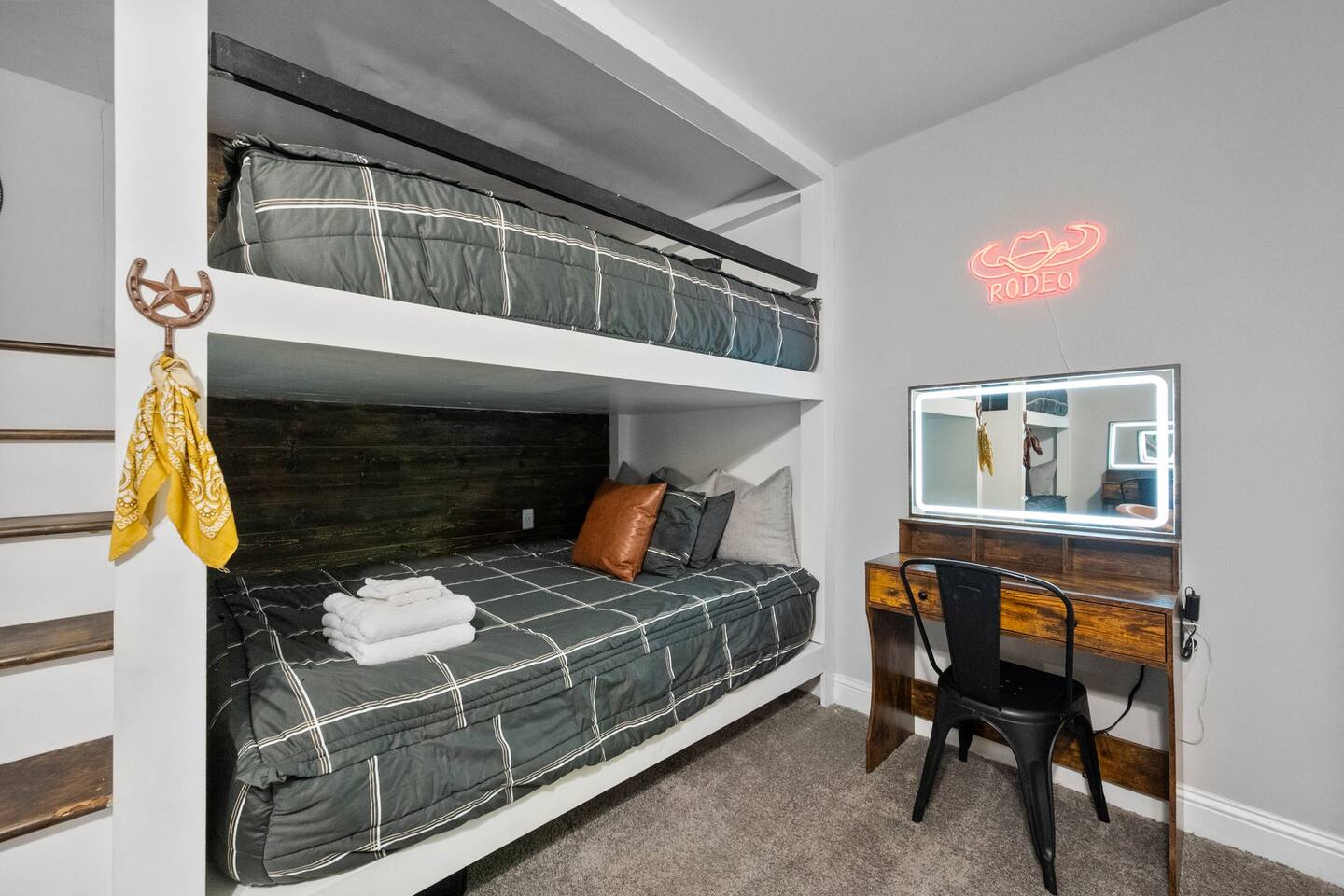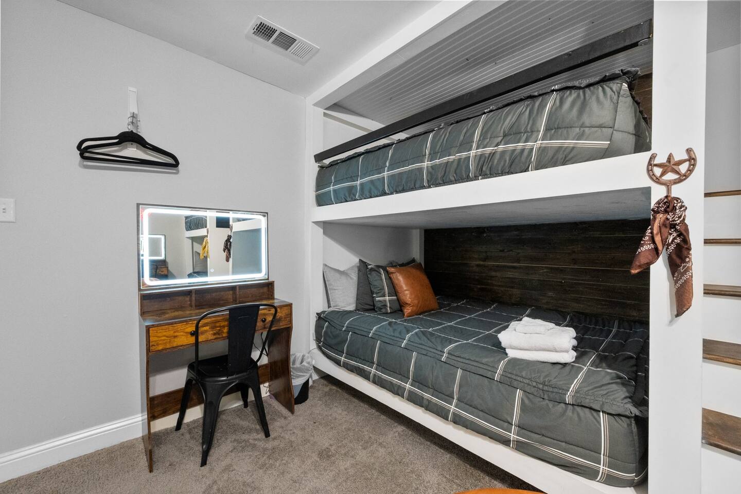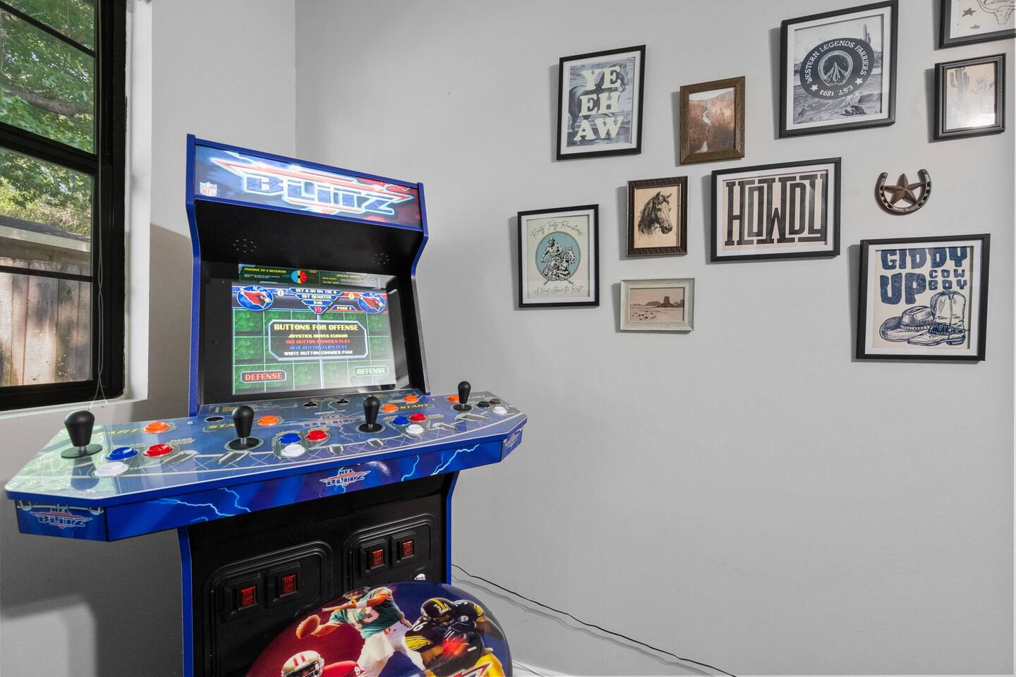 Neighborhood~ Our charming neighborhood is currently going through a transformation. It is one of the original neighborhoods in this lake community that is rapidly growing as our city grows. The street is quiet, and the neighbors are friendly. Enjoy the safety and privacy of our gated entrance and fenced-in parking located in the back entrance of our property through its alley entrance. Home~ Our recently updated home is completely stocked with everything you need for your large group. Each room includes a TV, Fan, hangers, black-out curtains, luggage rack, and a light up mirror vanity to get ready with or it can serve as a workspace. Our kitchen comes completely equipped with everything for a family large group to cook with. Children~ For young families, we have everything you need at the home. For no additional charge, the home comes with a standard full-sized crib with mattress and fitted sheet only, baby monitor, sound machine, black-out curtains and highchair. As a family of five, we know how helpful it is to have these items provided. Please feel free to ask for any special requests. Entertainment~ We believe that entertainment is essential, which is why each room comes equipped with a Smart TV, allowing you to watch your favorite shows and movies on streaming services. We do not currently have cable tv, but we also provide a plethora of boardgames, video games and outdoor games. We also have a large portable speaker and projector for outdoor movies. Pool~ NOT heated Rules~ *No large parties or unapproved guests. *Swim at your own risk. Do not leave children unattended by the pool. We are not responsible for any injuries or accidents. *No smoking/vaping inside. You will be charged an extra cleaning fee for any additional air treatments needed due to smoke smell. *No small children on the top bunks. *No fires in the indoor fireplace. *No glitter or confetti. *No tape on walls or wallpaper. You will be charge for damages. *No glass by the pool. *Pets must be pre-approved. *We’ve created a fun and unique space that’s perfect for celebrations and memorable getaways. However, we kindly ask that guests respect our home and our neighbors by adhering to our house rules. We do not allow large parties, unapproved guests, or smoking of any kind indoors. Please note that a fee will be charged if these rules are broken. Help us keep this special space enjoyable for everyone! Around town~ Our home is close to many shopping centers and restaurants. Just 1.5 miles away from the house you will be able to find a shopping center with big box stores like; Target, Marshals, Petsmart, Ross, Home Depot and more. There are also many dining places for you and your family to enjoy. Attractions~ In addition to the many amazing attractions offered in the nearby major cities, Grand Prairie has plenty to see and do itself. You’ll be close to nature with lots of parks and lakes nearby. Lynn Creek Park at Joe Pool Lake features boat ramps, waterside restaurants, picnic areas, beach areas, volleyball courts just a 1.5 mile drive! For some great family fun, Epic Waters Indoor Waterpark, Andretti Indoor Karting, Bolder Adventure Park and Main Event are located 4 miles away. Be wowed by the human oddities at Ripley’s Believe It or Not Museum, 11 miles away in neighboring Grand Prairie. You can also pay a visit to the first ever theme park in the famous Six Flags Over Texas and Hurricane Harbor, both 10 miles away. There’s no shortage of fun activities to fill your days! Major Cities~ We are about 25 minutes from downtown Dallas, Fort Worth and the airport. AT&T Stadium 10mi Globe Life 10 mi Six Flags 9 mi Hurrican Harbor 11 mi Grand Prairie Premium Outlets 2.8 mi Epic Waters Indoor Waterpark 3.2 mi Bolder Adventure Park 3.2 mi Joe Pool Lake 1.2 mi Mountain Creek Lake Park 3.8 mi Loyd Park 4.7 mi Dallas Baptist University 4.6 mi Hillside Village 5.5 mi Cedar Hill Shopping District 5.3 mi Grand Prairie Shopping District 5.8 mi Arlington Highlands 5.6 mi Hawaiian Falls 8 mi Tangle Ridge Golf Club 6.7 mi Lone Star Park 12 mi Stockyard 26 mi DFW 17 mi Love Field 22 mi
